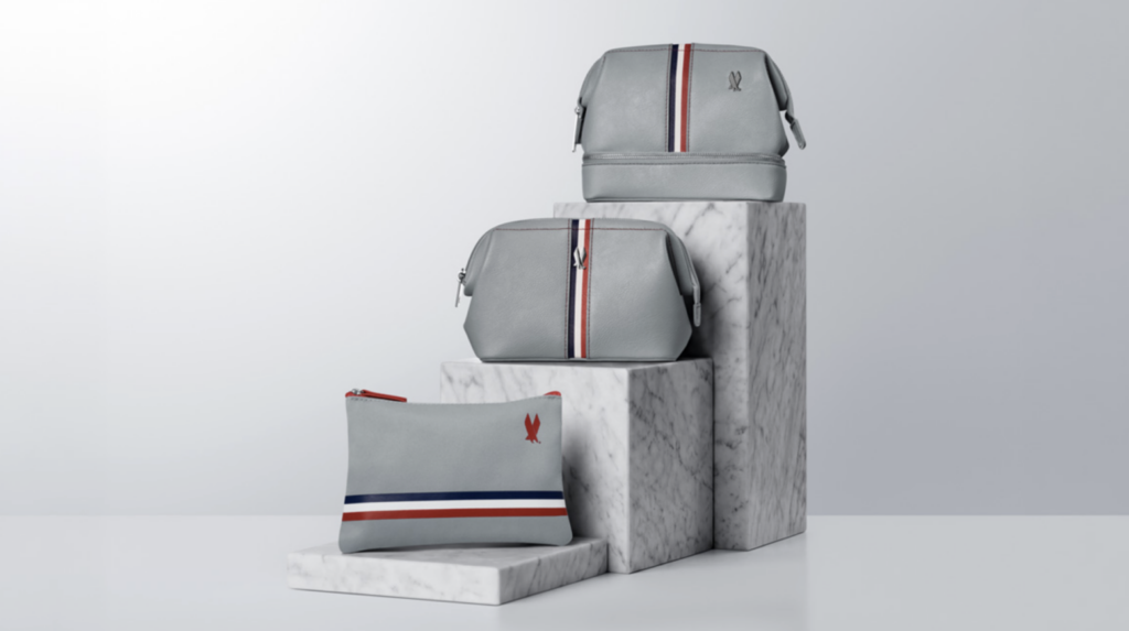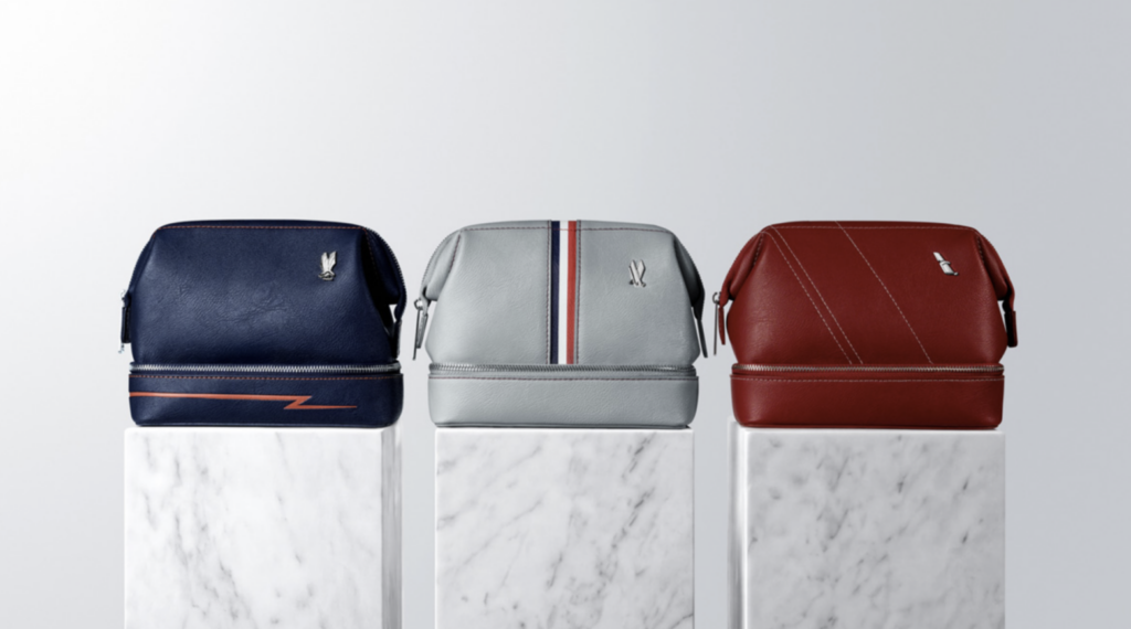 The Astrojet design, which features an orange lightning bolt on a navy blue bag, draws from the optimism of the early jet age with its bold color combination. Meanwhile, the Silverbird kit, with a metallic finish and tribar stripe channel, reflects the golden age of air travel. Finally, the Forward design takes the shape of a red bag complete with angled stitching, inspired by American’s flight symbol and newest seat designs, to represent the airline’s future.